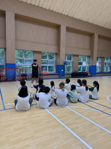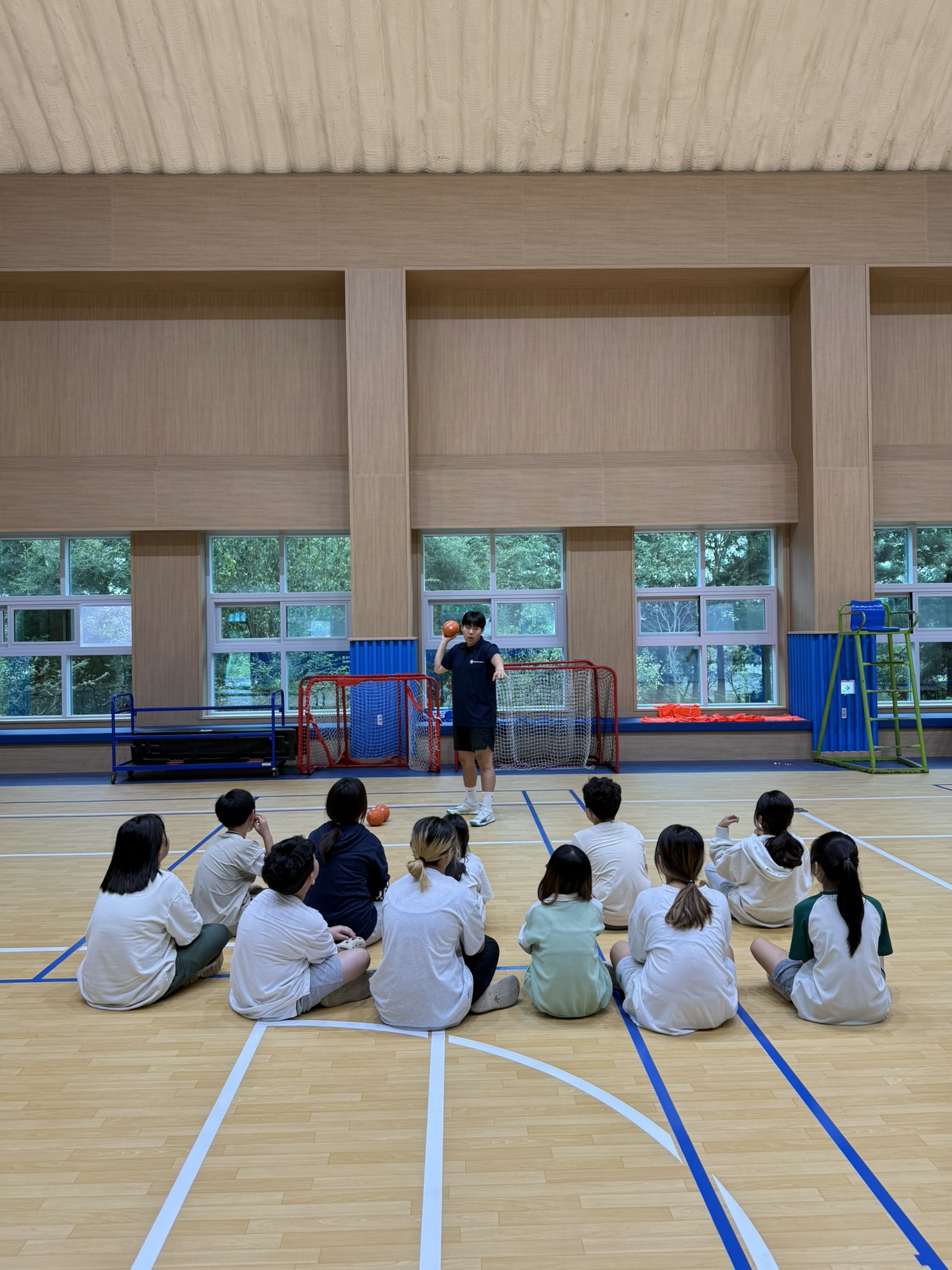 앉아서 핸볼 전문 강사 선생님의 설명을 들은 후 직접 공을 던지며 패스 연습을 해봤습니다.