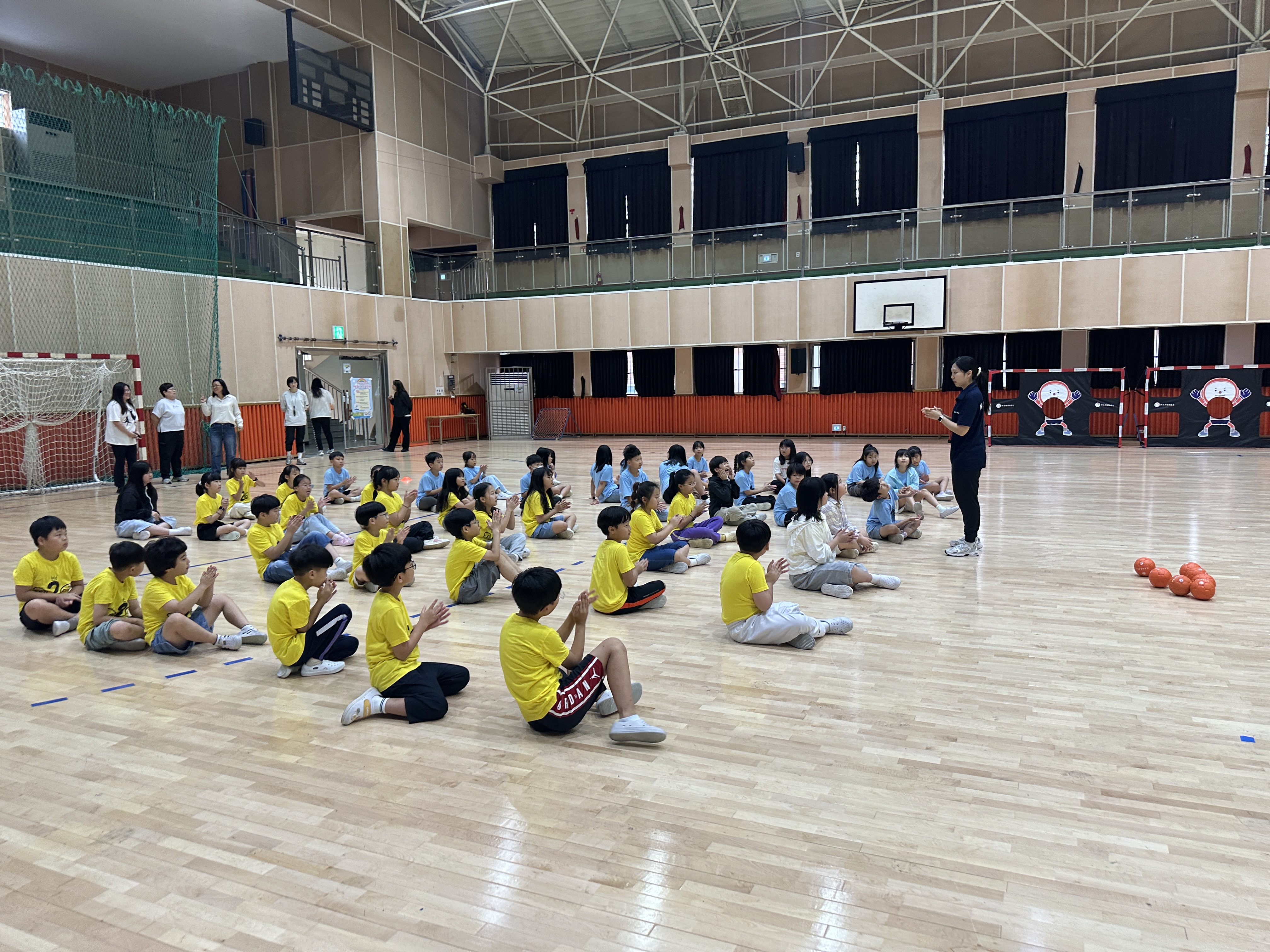 핸볼 전문 강사 선생님 말씀에 학생들은 집중해서 귀를 쫑긋, 진지한 모습이 정말 귀여웠습니다!